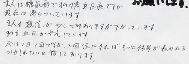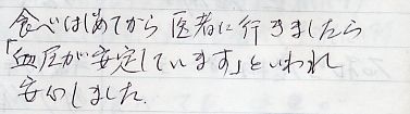 食べはじめてから医者に行きましたら「血圧が安定しています」といわれ安心しました。 |
