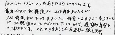 おいしいパンをいつもありがとうございます。最近になって血糖値が200前後あったのが130前後まで下って来ました。体重のほうはまだ変わりませんが血糖値の方はかくじつに下っており、感謝の気持ちでいっぱいです。これからもよろしくお願い致します。