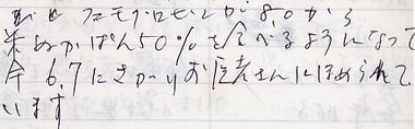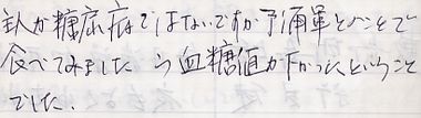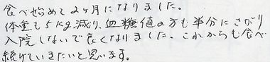 食べ始めて2か月になりました。体重も5kg減り、血糖値の方も半分にさがり入院しないで良くなりました。これからも食べ続けていきたいと思います。 |