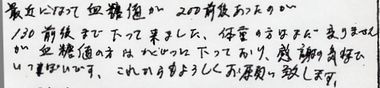 今年中は大変お世話になりました。薬を飲んでもなかなか血糖値が下がらなかったのがおかげ様で大変よくなっていきました。 |