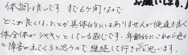 | 体調は良いです。まだ6か月なのでどこが良くなったとか具体的にはありませんが便通も良く体全体がシャキッとしている感じです。年齢的にこれから色々と障害が出てくると思うので継続して行きたいと思います。