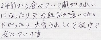 3年前から食べていて肌がきれいになったり夫の血圧が高いのが下がったり、大変うれしくて続けて食べています。 |