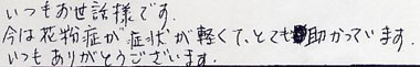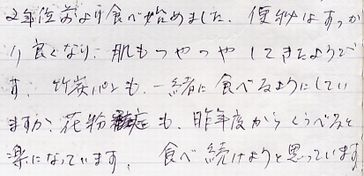 | いつもお世話様です。今は花粉症が症状が軽くてとても助かっています。いつもありがとうございます。 | 2年ぐらい前より食べ始めました。便秘はすっかり良くなり、肌もつやつやしてきたようです。竹炭パンも一緒に食べるようにしていますが、花粉症も昨年度からくらべると楽になっています。食べ続けようと思っています。 |