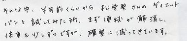 半年前くらいから松栄堂さんのダイエットパンを試したところ、まず便秘が解消し、体重も少しずつですが確実に減ってきています。 |