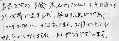 お米をやめ3食米ぬかパンにして4日目から別世界がきました。毎日お通じがあり、2回~4回あります。お腹がとてもやわらかくなりました。ありがとうございます。 |